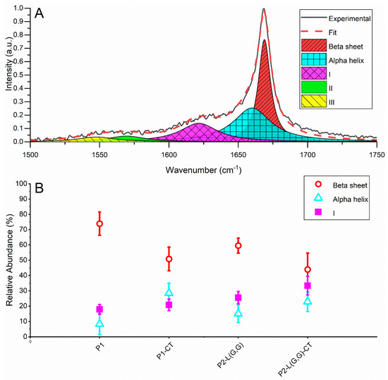 (A) A deconvolution example of the Amide-I band showing peak assignment and placement. (B) The relative abundance of beta-sheets estimated from the area of the 1670 cm−1 peak for the different systems and the relative abundance of α-helix estimated from the area of the 1655 cm−1 peak for the different systems.