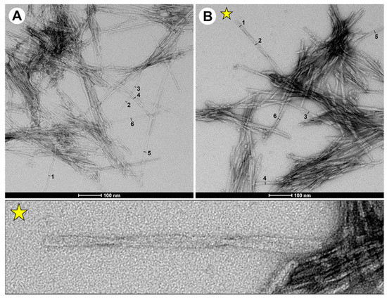 To analyse the morphology of fibrils, we used transmission electron microscopy (TEM). TEM images show that double-fragment fibrils incubated for 72 h resulted in spheroidal oligomers, shorter protofibrils, protofilaments and more mature fibrils (Figure 3A,B, with representative images in Figures S11 and S12). A previous assessment of fibrils from the capped single-fragment (P1) peptide indicated amyloid structure but did not demonstrate fibrils with morphologies similar to that for the full-length protein [15]. Notably, the use of designed double-fragment peptide models resulted in fibrils and morphologies similar to that of the full-length protein [28]. In general, elongated and mature fibrils of the P2-L(G,G) peptide exhibited rod-like structures of ~100–1000 nm in length and either 5 nm (objects measured 1, 2 and 3 in image panel A) or 10 nm (objects 4, 5 and 6 in image panel A) in width (Table S2, for fibril widths). Fibrils with a width of 5 nm were associated with single protofilaments, and fibrils with a 10 nm width were associated with more mature fibril structures.