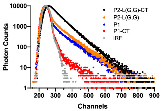TCSPC analysis of ThT fluorescence of samples comprised of 0.1 mg⋅mL−1 of peptide and 10 μM of ThT. Decay profiles are shown for the instrument response function (IRF, grey), P1-CT (red), P1 (blue), P2-L(G,G) (orange) and P2-L(G,G)-CT (black). Each channel was calibrated to 28 ps. The time to reach 10,000 photons in the peak channel was found to be dependent on the relative contribution of short- and long-lived photons. Under the conditions employed, a measurement typically required 3–7 min of photon sampling (longest time for the non-amyloid P1-CT sample).