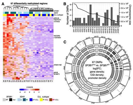 Differentially methylated regions (DMRs) in chronic lymphocytic leukemia (CLL) patients with SF3B1 mutation. (A) Methylation levels of 67 DMRs between CLL patients with and without SF3B1 mutation. The samples were clustered based on Euclidean distances with a complete linkage agglomeration method. White cells in the IGHV annotation denote missing information. CLL-subtype was defined by Oakes et al. based on the 18 loci selected by the authors [25]: low-programmed (LP-CLL), intermediate-programmed (IP-CLL), and high-programmed (HP-CLL). See Figure 4 and Figure S7. (B) Numbers of DMRs between CLL patients with and without SF3B1 mutation identified per chromosome. (C) Circos plot with the outer panel showing the log2 fold change in the 67 DMRs between SF3B1mut and SF3B1WT CLL patients in a −3.7 to 0.2 range. The next three panels show, from outside to inside, the average density of 250 bp regions tested for differential methylation per chromosome within (i) genes; (ii) CpG islands (CGI); (iii) gene promoters. The darker the grey color, the higher the density.