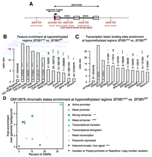 Genomic features of SF3B1mut vs. SF3B1WT differentially methylated regions (DMRs) at binding sites. (A) Schematic visualization of features used in (B) A promoter was defined as a region +/− 2000 base pairs (kbp) from a transcription start site. CpG islands (CGI) were obtained from [47]. A CGI shore was defined as a 2-kbp region flanking a CGI up—and downstream. A distal CGI is any CGI outside of promoter regions. (B) Enrichment analysis of genomic features with differentially methylated regions (DMRs) shown by odds ratio. Enhancer regions are taken from [48]. Transcription factor binding sites (TFBS, n = 122) were derived from ENCODE Encyclopedia v.3. PRC2 binding sites were defined as binding sites for EZH2 or SUZ12. (C) Enrichment analysis of the TFBS listed in (B)—only 11 TFBSs with the highest odds ratio are shown. (D) Enrichment analysis of the chromatin states as derived from GM12878 cell line [49,50]. Significance is denoted by stars with adjusted p-value (false discovery rate) < 0.05 = “*”; < 0.01 = “**”; < 0.001 = “***”; < 0.0001 = “****”; ≥ 0.05 = “ns”.