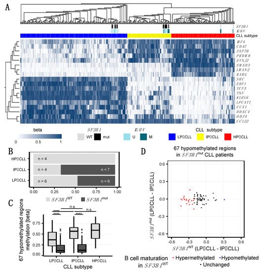 Changes in the DNA methylome in SF3B1mut chronic lymphocytic leukemia (CLL) samples occur partly independent of B cell maturation. (A) Heatmap showing unsupervised clustering of 27 samples from this study and 329 CLL Research Consortium (CRC) samples from Oakes et al. [25] based on beta methylation values of the 18 most variable regions among the three CLL subtypes. White cells in the SF3B1 and IGHV annotations denote missing information. The inclusion of our 27 samples led to re-classification of 5 out of the 329 CRC samples (<2%) from the LP-CLL to the IP-CLL subtype. (B) Proportion of SF3B1WT and SF3B1mut samples among the three CLL subtypes. (C) Methylation values of the 67 hypomethylated regions SF3B1mut samples according to the SF3B1 mutational status and CLL subtype. Wilcoxon test significance is denoted by stars with p-value < 0.0001 = “****”; ≥ 0.05 = “ns”. (D) Comparison of the methylation programming between CLL patients with and without SF3B1 mutation within 67 differentially methylated regions (DMRs) identified between SF3B1mut CLL and SF3B1WT CLL samples. Due to the lack of high-programmed CLL samples with SF3B1mut in our dataset (B), the methylation programming is shown as the difference between the average methylation of low-programmed (LP-) and the average methylation of intermediate-programmed (IP-) CLL samples in each of the SF3B1 mutational groups. (B) cell development-related DMRs hypo- or hyper-methylated in LP-CLL vs. IP-CLL in wild type samples (difference ≥ 20% in SF3B1WT) are shown in blue and red, respectively.