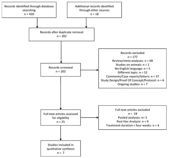 The full texts of the remaining 25 citations were examined in more detail, and we concluded that 18 studies did not meet the inclusion criteria because 5 were pooled analyses, 9 were post-hoc analyses and 4 reported a duration of ESK treatment shorter than 4 weeks. Thus, 7 studies met the inclusion criteria and were included in the present review (Figure 1).