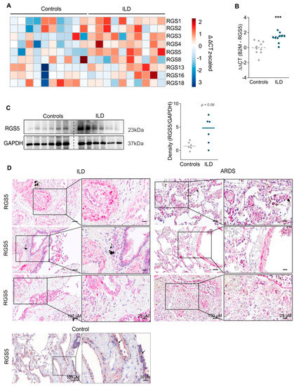 Increased RGS5 expression in interstitial lung disease (ILD) and acute respiratory distress syndrome (ARDS) in tissue from patients undergoing lung transplantation. (A) Heat map depicting the expression (RT-qPCR) of the RGS subfamily members (RGS1, 2, 3, 4, 5, 8, 13, 16, 18) in lungs from healthy controls (n = 10 different patients) and ILD patients (n = 10). (B) RGS5 mRNA expression in the lungs of healthy controls (n = 10) and ILD patients (n = 10). ΔΔCT values are calculated by ΔCT (target gene)—ΔCT (averaged controls). Data are presented as scatter dot plot and analyzed using unpaired two-tailed t-test, *** p < 0.001. (C) RGS5 protein levels compared via immunoblotting in lungs from controls (n = 6) and ILD patients (n = 6). GAPDH served as a loading control. (D) Representative cross-sections (n = 3) of ILD, ARDS (dark pink) and controls (brown) lung tissues showing RGS5 expression by immunohistochemical (IHC) staining; scale bar: 100, 25 and 20 µm.