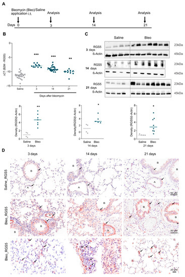 Regulation of RGS5 expression in mouse lungs after bleomycin treatment. (A) Schematic overview of the bleomycin challenge. (B) mRNA expression of RGS5 in the lung after bleomycin injury. ΔCT values, calculated by ΔCT = CT (reference gene)—CT (target gene) (minimum n = 10 different mice). Data are presented as scatter dot plots and analyzed using one-way ANOVA with Bonferroni’s multiple comparison test, ** p < 0.01, *** p < 0.001. (C) RGS5 protein expression levels are shown via immunoblotting. β-actin served as a loading control as shown in a representative image (n = 4 to 8 mice). Data are presented as scatter dot plots and analyzed using unpaired two-tailed t-test, * p < 0.05; ** p < 0.01. (D) Representative cross-sections (n = 3) of the lung tissue obtained from saline- (upper panel) and bleomycin- (middle and lower panel) treated animals. Selection of positive RGS5 staining (brown by IHC staining) in structural and inflammatory cells are indicated by arrows; scale bar: 20 or 50 µm as indicated. A = pulmonary arteries, B = bronchioles.