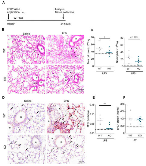 Loss of RGS5 impairs neutrophil recruitment in LPS-induced lung injury. (A) Schematic overview of the LPS treatment. (B) H&E staining, arrows indicating the inflammatory cells; scale bar: 100 µM. A = pulmonary arteries, B = bronchioles. (C) Total cell and neutrophil numbers from lung tissue. (D) Anti-Ly6G IHC staining for neutrophils on lung tissue cross-sections, arrows indicating neutrophils; scale bar: 50 µM. A = pulmonary arteries, B = bronchioles. (E) MPO activity in the lung tissue (F) BALF protein measurements using BCA assay. Dotted lines represent means of WT and RGS5-/- saline-treated pooled together, as no differences were observed. The dashed lines in C, E, and F show the mean values in control animals. Data are presented as scatter dot plots (n = 4–6 mice) and analyzed using unpaired two-tailed t-test, * p < 0.05; ** p < 0.01.