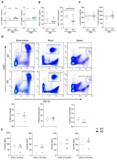 Characterization of RGS5-deficient neutrophils. Neutrophil recruitment-specific cytokine measurements in WT and RGS5-/- mice show (A) mRNA expression of CXCL1 and CXCL2 in lung tissue (n ≥ 7 mice/group). (B) CXCL1 and CXCL2 protein amount in BALF. ΔCT values, calculated by normalizing the expression of target genes to β2M expression, are shown. (n ≥ 7 mice/group). (C) CXCL1 and CXCL2 protein amount in lung tissue. Dotted lines represent mean of WT and RGS5-/- saline-treated pooled together, as no differences were observed. (n ≥ 7 mice/group). (D) Representative gated cell population from flow-cytometry for the assessment of Ly6G and cd11b positive neutrophils from bone marrow, blood and spleen with their respective quantification. (E) Assessment of change in CXCR2 and CXCR4 receptor expression on the neutrophils from WT and RGS5-/- mice after stimulation with CXCL1 and CXCL12 for 5 and 15 min measured via flow-cytometry. Four independent experiments were performed using 2–3 mice pooled for each genotype per experiment. Data are presented as scatter dot plots and analyzed using unpaired two-tailed t-test. The dashed lines in (A–C) show the means in control animals. * p < 0.05, ** p < 0.01 and *** p < 0.001 indicates the difference from saline treated animals.