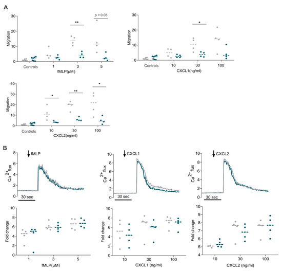 The isolated neutrophils were re-suspended in 2 μM fluo-3-acetoxymethyl ester (Ca2+-sensitive dye) (Thermofischer, Waltham, MA, USA) and 0.02% Pluronic F-127 (Thermofischer, Waltham, MA, USA) for 1 h at RT in the dark. Baseline response was recorded for 60 s before addition of any agonist. As the agonist to elicit the Ca2+ response in the neutrophils, different concentrations of the chemoattractants fMLP, CXCL1 and CXCL2 were applied. Intracellular Ca2+ level differences were quantified in fluo-3 positive cells in FL1- channel via a FACSCalibur flow cytometer (BD, Franklin Lakes, NJ, USA). The Ca2+ response for each agonist was corrected to its own baseline.