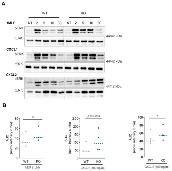 Effect of RGS5 loss on downstream signaling. (A) Representative blots of ERK phosphorylation and total protein expression in neutrophils isolated from WT and RGS5-/- mice. The neutrophils were stimulated with fMLP, CXCL1and CXCL2 for indicated time points. pERK values were internally normalized to the band intensity of total ERK at 2, 5, 10 and 30 min. NT = non-treated. 3–4 representative blots per chemoattractant. The 3–4 independent experiments were performed using 2–3 mice pooled for each genotype per experiment. (B) Summarized AUC values for all chemoattractants for both genotypes. Values represent normalized intensity x minutes. Data are presented as scatter dot plots and analyzed using paired t-test, * p < 0.05.