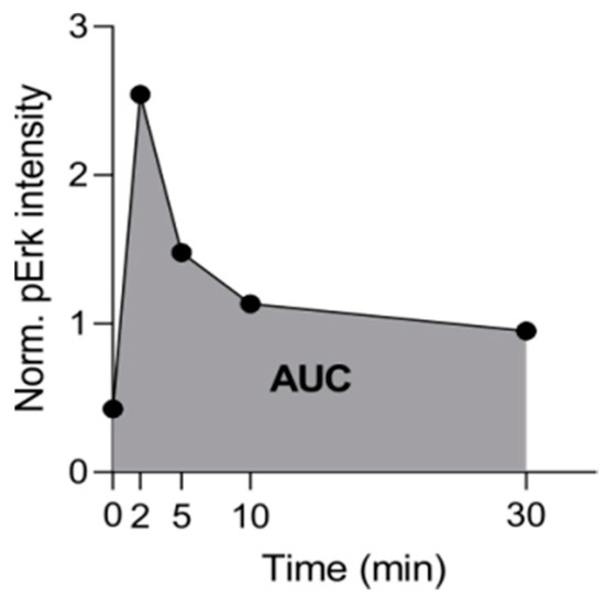 Isolated neutrophils (300,000 cells/condition) were stimulated with fMLP (1 µm), CXCL1 (100 ng/mL), and CXCL2 (100 ng/mL) for the indicated times (2, 5, 10 and 30 min). Cell pellets were washed with PBS and resuspended after centrifugation in radioimmunoprecipitation lysis buffer containing protease and phosphatase inhibitors, for protein extraction. Further details on western blotting procedure are provided in Supplementary Material and Methods. The details of antibodies are given in Supplementary Table S4. The calculation for pERK values was performed via internally normalized to the band intensity of tERK at 2, 5, 10 and 30 min. For quantification of pERK for the same time period (relative band intensities versus time), the area under the curve (AUC) was calculated [41,42]. This representation of the data allows quantification of total pERK throughout the detection period. The scheme is depicted below (Figure 9).