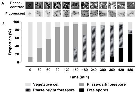 Morphological images of the sporulation process (A) and the proportions of different cell types (B). Time 0 is the moment after the cell culture is diluted. Phase-dark forespores include cells exhibiting polar division, engulfment, and engulfed forespores before becoming phase-bright. Fluorescent images were visualized with the membrane dye Nile Red.