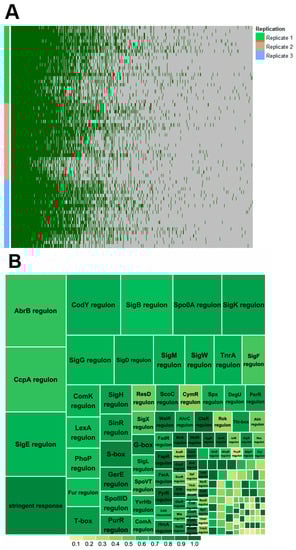 Overview of the quantification of proteins during sporulation (A) and their involved transcriptional regulons (B). (A) Visualization of data completeness of the quantified proteins. Columns indicate proteins, in total 2370 proteins, and rows indicate samples from three replicates with 23 timepoints in each (from top to bottom in each replicate are timepoints from 0 to 480 min). Dark green and grey indicate observed and missing values, respectively. (B) Tree-map summary of regulons of the quantified proteins. Sizes of the various rectangles correspond to the number of quantified proteins controlled by the regulon; the color of the squares indicates the ratio of the fractions of the quantified proteins belonging to the regulon to the total protein number in the regulon according to the color legend. Regulon names are not shown throughout for graphical reasons. Note that proteins could occupy more than one regulon.