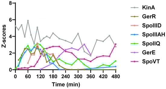 Sporulation is controlled by a hierarchical regulatory network []. It involves sporulation master regulator Spo0A initiating sporulation and directly and indirectly controlling forespore and mother cell specific regulators, SigE, SigF, SigG, SigK. All these 5 proteins were quantified in some of the timepoints but failed to show clear expression profiles (Table S1, see Supplementary Materials). In the phosphorelay involved in phosphorylating Spo0A, KinA was quantified in all timepoints, and its protein amount gradually decreased (Figure 3). Other phosphorelay proteins were also quantified in a number of timepoints (Table S1). Mother cell early sporulation regulators GerR and SpoIIID are transcriptionally activated by SigE and positively or negatively regulate sporulation. Both proteins were quantified to upregulate in the first 60 min and gradually decreased after 180 min (Figure 3). SpoIIIAH and SpoIIQ are components of a feeding tube connecting mother cell and forespore and are important for SigG activation [,]. They were upregulated shortly after sporulation initiation, reached a peak amount at 90–105 min, and then decreased (Figure 3). The SigK-activated mother cell late sporulation regulator GerE was upregulated after 120 min and the SigG-activated forespore regulator SpoVT was upregulated after 90 min (Figure 3).