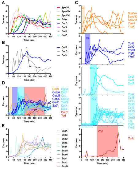 Expression of spore coat proteins and small acid soluble proteins. For point-to-point connection, a gap is left at each missing value. (A) Expression of morphogenetic coat proteins. (B) Expression of CotE, CotO, and CotH. CotO is expressed earlier than CotE. CotH has a higher level of protein than CotE at 45 min. (C) Classification of coat proteins according to their localization dynamics. Adapted from SubtiWiki (http://subtiwiki.uni-goettingen.de/ (accessed on 16 December 2020).) []. Class I (CI), early localizing spore coat proteins cover the outer forespore membrane; Class II (CII), early localizing spore coat proteins begin to encase the spore only after engulfment is complete; Classes III, IV (CIII, IV), early and late localizing spore coat proteins start to encase the spore only after completion of engulfment and the appearance of phase dark spores; Class V (CV), late localizing spore coat proteins localize exclusively to phase dark spores; Class VI (CVI), late localizing spore coat proteins localize exclusively to phase bright spores. Proteins upregulated in a similar time period are denoted with the same color. (D) Classification of the unassigned coat proteins. (E) Expression of small acid-soluble spore proteins (SASPs). Z-scores on the Y-axis represent the quantified value of every protein normalized to have a standard deviation of 1. Note that detailed information on the expression levels of all these individual proteins can be found in Tables S1 and S2.
