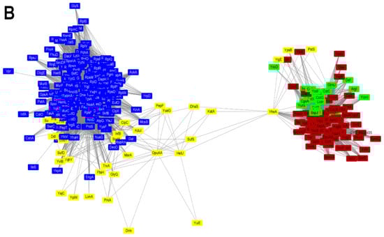Proteins showing similar expression profiles are considered to be controlled by the same regulatory system or play roles in related functions. To investigate overall protein expression and identify possible unreported sporulation proteins, a protein co-expression analysis was performed using WGCNA []. Proteins showing similar expression profiles are clustered into the same co-expressed modules. Four co-expressed modules were detected in the protein co-expression network analysis, where modules are annotated by different colors (Figure 6A). The number of proteins per module were 267 (blue), 93 (brown), 27 (green), and 42 (yellow). Table S2 lists the protein members of modules. Figure 6B shows the co-expression network of the most abundant co-expressed proteins. Proteins in modules brown and green are upregulated during sporulation. They are involved in sporulation and are members of the SigG, SigK, SigE, SigF, GerE, and GerR regulons (Figure S1). Proteins in module blue are downregulated during sporulation, and contain proteins involved in metabolism and translation and are mainly regulated by the stringent response (Figure S1). Module yellow proteins are involved in metabolism and some of these proteins are regulated by the stringent response and SigB (Figure S1). Proteins not included in regulons but co-expressed within sporulation modules brown and green are identified and listed in Table 1. Perhaps these proteins also have important, but as yet unknown roles in sporulation.