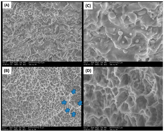 SEM images of TSV MP-1 HA (A,C) and cmSLA (B,D) implant surfaces at a magnification of 1600× at a 10 µm scale (A,B) and 6400× at a 2 µm scale (C,D). Arrows in (B) indicate approximately 1–4 µm pits superimposed on larger craters.