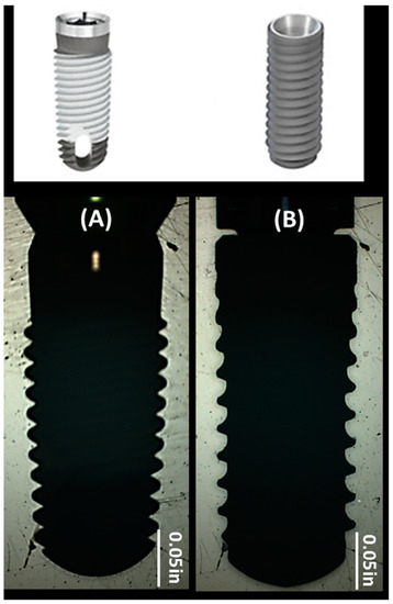 Macrogeometry of (A) TSV MP-1 HA and (B) cmSLA implant systems. The implants have different thread shapes and pitches. TSV MP-1 HA also has a vent in the apical region, which is not seen in the picture taken by the MicroVu system.