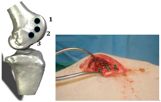 (Left) Three implants randomly inserted into the femoral condyle of the sheep in the positions 1, 2, and 3. (Right) The green components are the transfer mounts that are left in place for photo capturing purposes and were removed and replaced by cover screws prior to closing the wound.