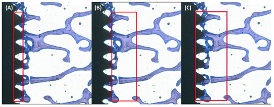 Histomorphometric measurements were performed by defining the ROI to calculate BAF% in (A) intra-threads, (B) adjacent 1 mm host bone bed, and (C) the total of intra-threads plus adjacent 1 mm host bone bed regions.