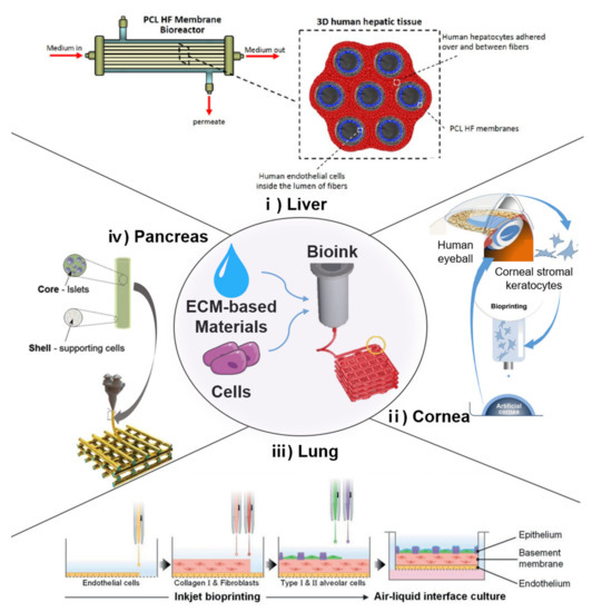 Applications of tissue engineering based on 3D bioprinting. (i) Poly(ε-caprolactone) (PCL) hollow fiber membrane bioreactor and scheme of 3D human hepatic tissue realized by culturing human hepatocytes over and between PCL HF membranes [129]. (ii) Bioprinting of functional and biomimetic 3D corneal model using hydrogels and cultivated human corneal stromal keratocytes [168]. (iii) Fabrication of alveolar barrier model with all cells inkjet-printed in a layer-by-layer manner [169]. (iv) coaxial printing approach for establishing vascularized bioartificial pancreatic constructs with pancreatic insulin-secreting cells housed in core component [170]. (clockwise).
