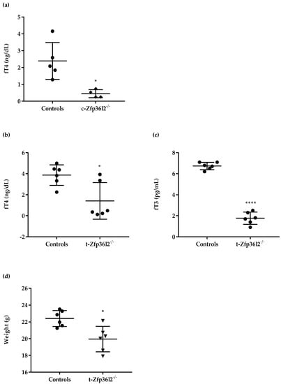 Phenotype of constitutive and thyroid-specific Zfp36l2-/- mice. The levels of cfT4 were determined by ELISA in blood collected from the controls (n = 5) and conventional Zfp36l2-/- (Zfp36l2-/- n = 4) female mice at PND 21 (a). The levels of cfT4 (b) and cfT3 (c) were determined by ELISA in blood collected from controls (n = 6) and t−Zfp36l2-/- (n = 6) female mice at the PND 90. Body weight evaluation of the t−Zfp36l2-/- mice measurements were collected at PND 90 (d). Data are reported as mean ± standard deviation * p < 0.05; **** p < 0.0001.