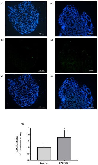 To more completely characterize the thyroid phenotype, thyrocyte proliferation and apoptosis were investigated. No major differences in proliferation levels (Ki67 staining) were observed between the t-Zfp36l2-/- and control females (data not shown). Furthermore, in order to detect the possible presence of apoptosis, we performed Tunel assay staining. In this way, we detected a slight increase of apoptotic nuclei (Figure 3a–f) in thyroids from t-Zfp36l2-/- vs. control females. These data were associated with an increase in the ratio of Bax over Bcl2 mRNA (Figure 3g).