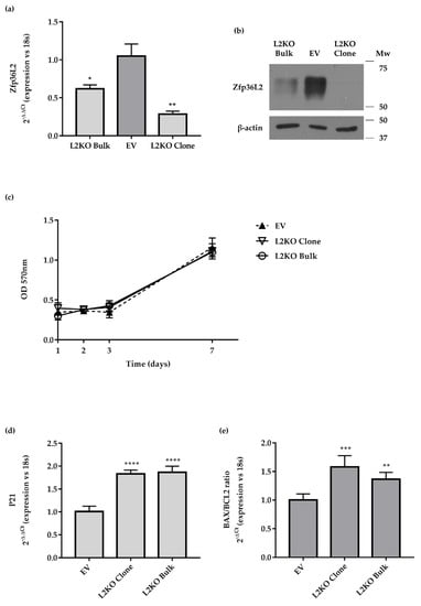 L2KO cells did not show any major changes in cellular morphology vs. EV cells. Since transcripts playing a role in the regulation of the cell cycle and apoptosis are targeted by ZFP36L2 in other cell types [], we tested both cellular activities. MTT assays did not show any major differences in the proliferation of exponentially growing EV and L2KO cells (Figure 5c). Despite that, we found an increased expression of P21/Waf1 (Figure 5d), suggesting an impairment of the cell cycle. Furthermore, the increased ratio of Bax/Bcl2 transcripts pointed to a possible increase in apoptosis (Figure 5e).
