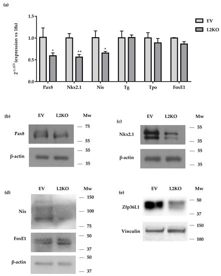 The molecular characterization of thyroid-specific or enriched transcripts and proteins conducted in exponentially growing EV and L2KO cells mainly agreed with what we found in mice. Indeed, Pax8, Nkx2.1, and Nis mRNAs were significantly reduced (Figure 6a), as were their encoded proteins (Figure 6b–d, Figure S5) in L2KO vs. EV. In contrast, no differences were observed for Tg and Tpo in the L2KO cells (Figure 6a) or for Foxe1/TTF2 (Figure 6a,d, Figure S5). As members of the ZFP36 family might have redundant functions, we analyzed the cellular content of ZFP36L1 and ZFP36 in the L2KO cells. Levels of ZFP36L1 were reduced in L2KO vs. EV (Figure 6e, Figure S5), whereas Zfp36 mRNA showed a slight trend towards a decrease (data not shown).