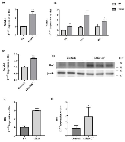 Modulation of Notch1 pathways in t-Zfp36l2-/- mice and L2KO cells. (a) RTqPCR analysis of Notch1 expression in L2KO and EV cells and (b) RTqPCR analysis of Notch1 expression and its modulation by TSH signaling in L2KO and EV cells; 5H, cell culture medium deprived from TSH; 24 h and 48 h, time points of TSH signalling induction using complete cell culture medium. (c) RTqPCR analysis of Notch1 expression in thyroid extracts from t−Zfp36l2-/- (n = 3) and control (n = 3) mice. (d) Western blotting analysis of HES1 in extracts from thyroid samples of t−Zfp36l2-/- (n = 3) and control mice (n = 3). (e) RTqPCR analysis of Id4 mRNA in L2KO and EV cells, (f) thyroid extracts from t−Zfp36l2-/- (n = 3) and control (n = 3) mice. RTqPCR data are reported as mean ± standard deviation of ∆∆Ct values (FC values of gene normalized vs. FC values of 18SrRNA to obtain ∆Ct values of samples; ∆Ct values of KO samples are normalized vs. ∆Ct of control samples to obtain ∆∆Ct values) in KO (n = 3) and controls (n = 3); *p < 0.05; ** p < 0.01; *** p < 0.001; **** p < 0.0001.