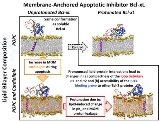 Tyagi, V.; Vasquez-Montes, V.; Freites, J.A.; Kyrychenko, A.; Tobias, D.J.; Ladokhin, A.S. Effects of Cardiolipin on the Conformational Dynamics of Membrane-Anchored Bcl-xL. Int. J. Mol. Sci. 2021, 22, 9388. https://doi.org/10.3390/ijms22179388