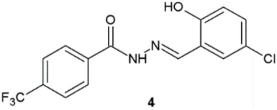 - Krátký, M.; Bősze, S.; Baranyai, Z.; Stolaříková, J.; Vinšová, J. Synthesis and biological evolution of hydrazones derived from 4-(trifluoromethyl)benzohydrazide. Bioorg. Med. Chem. Lett. 2017, 27, 5185–5189. [Google Scholar] [CrossRef]