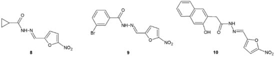 - Popiołek, Ł.; Rysz, B.; Biernasiuk, A.; Wujec, M. Synthesis of promising antimicrobial agents: Hydrazide-hydrazones of 5-nitrofuran-2-carboxylic acid. Chem. Biol. Drug. Des. 2020, 95, 260–269. [Google Scholar] [CrossRef]