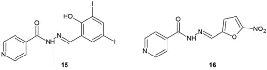 - Popiołek, Ł.; Biernasiuk, A.; Berecka, A.; Gumieniczek, A.; Malm, A.; Wujec, M. New hydrazide–hydrazones of isonicotinic acid: Synthesis, lipophilicity and in vitro antimicrobial screening. Chem. Biol. Drug. Des. 2018, 91, 915–923. [Google Scholar] [CrossRef] [PubMed]