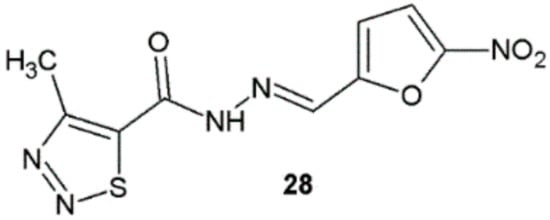 - Paruch, K.; Popiołek, Ł.; Biernasiuk, A.; Berecka-Rycerz, A.; Malm, A.; Gumieniczek, A.; Wujec, M. Novel Derivatives of 4-Methyl-1,2,3-Thiadiazole-5-Carboxylic Acid Hydrazide: Synthesis, Lipophilicity, and In Vitro Antimicrobial Activity Screening. Appl. Sci. 2021, 11, 1180. [Google Scholar] [CrossRef]