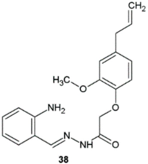 - Rohane, S.H.; Chauhan, A.J.; Fuloria, N.K.; Fuloria, S. Synthesis and in vitro antimycobacterial potential of novel hydrazones of eugenol. Arab. J. Chem. 2020, 13, 4495–4504. [Google Scholar] [CrossRef]
