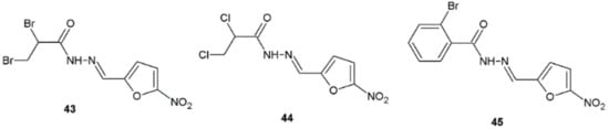 - Popiołek, Ł.; Biernasiuk, A. Synthesis and investigation of antimicrobial activities of nitrofurazone analogues containing hydrazide-hydrazone moiety. Saudi Pharm. J. 2017, 25, 1097–1102. [Google Scholar] [CrossRef] [PubMed]