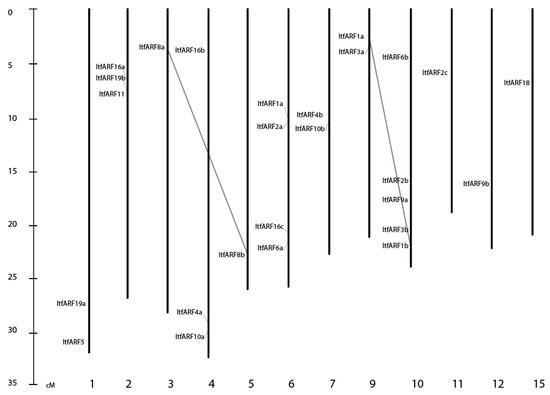 The 25 identified ARF genes were located among the 15 chromosomal pairs with the exclusion of Chr. 8, 13, and 14 as no ARF genes were mapped there. Most of the genes stacked onto a select few chromosomes (Figure 2), having five genes on chromosome 10 (19.2%), four genes on chromosome 6, three genes each on chromosomes 2, and 4, two genes each on chromosomes 1, 7, 9, and 11, and then one gene on chromosomes 3, 5, 12, and 15. The ARF genes, ItfARF8a and ItfARF8b and ItfARF1a and ItfARF1b, are the only two sets of duplicate genes that met the 80% sequence similarity for each of their respective nucleotide sequences.