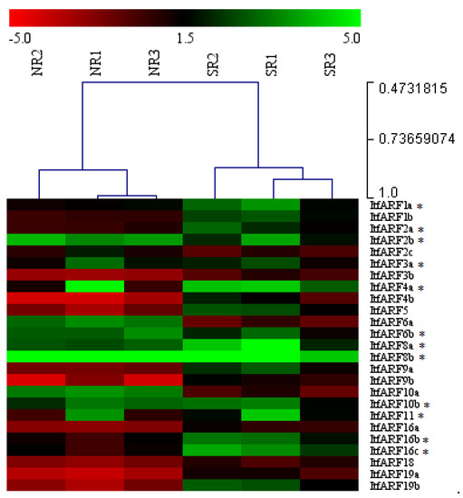 Figure 4. Heat map of ARF gene expression within all six biological samples of both the normal root and the storage root. The tissue samples are named from left to right at the top of the figure, and the names of the 25 genes are directly to the right of the figure. The expression rankings are shown using a range of color: higher gene expression is represented by green; lower expression, red; and median expression, black. *’s denotes which genes are statistically different, * p < 0.05.