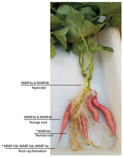 Figure 5. Five-week-old I. batatas normal root and storage root samples. Areas labeled correspond to where those genes are most likely expressed. An * denotes ItfARF8a and ItfARF8b, as their function is predicted to affect overall root growth and development.