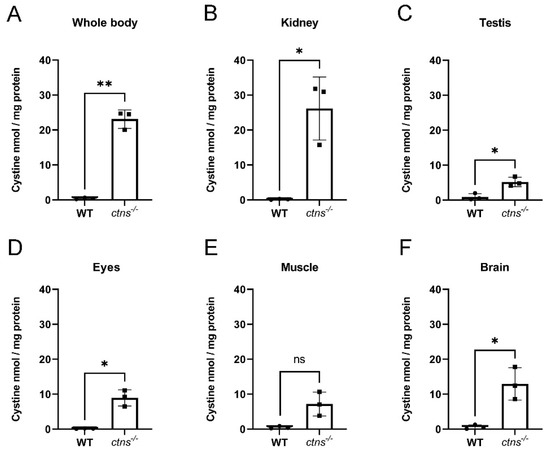 Cystine content in homogenates of wild-type and ctns−/− zebrafish. (A–F) Cystine content in whole body (A), kidney (B), testis (C), eyes (D), muscle (E) and brain (F) in wild-type and ctns−/− 18-month-old male zebrafish. Cystine concentration is expressed as nmol/mg protein. Each dot represents one zebrafish, for a total of n = 3 wild-type and n = 3 ctns−/− 18-month-old male zebrafish; unpaired t test with Welch’s correction, two tailed: * p < 0.05; ** p <0.01; ns: not significant.