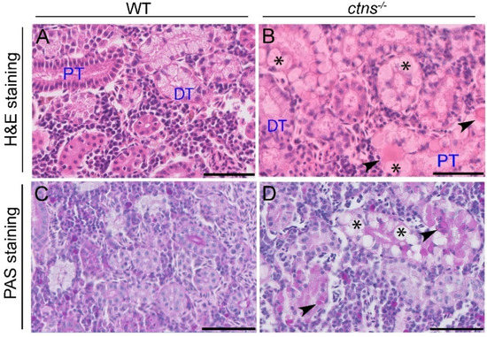 Kidney histology in wild-type and ctns−/− zebrafish. (A,B) Representative images of renal tubules of wild-type (A) and ctns−/− (B) 18-month-old zebrafish. Details of proximal tubules with hyaline-like eosinophilic droplets (black arrowheads) and cytoplasmic vacuoles (*). H&E staining. The scale bars represent 50 µm. (C,D) Representative images of the PAS staining of renal tubules of wild-type (C) and ctns−/− (D) 18-month-old zebrafish. Details of proximal tubules with hyaline-like droplets (black arrowheads) and cytoplasmic vacuoles (*). PAS staining. The scale bars represent 50 µm. PT: proximal tubule; DT: distal tubule.