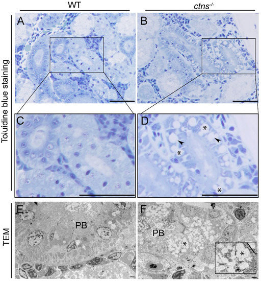Kidney cystine crystals in wild-type and ctns−/− zebrafish PTECs. (A,B) Representative toluidine blue-stained images of renal proximal tubules in wild-type (A) and ctns−/− (B) 18-month-old zebrafish. The scale bars represent 50 µm. (C,D) Figure 3C,D show a higher magnification of Figure 3A,B. Details of renal proximal tubules with cytoplasmic vacuoles ((D); *), rectangular and polymorphous vacuolar spaces ((D); black arrowheads). (E,F) Representative TEM images of the renal proximal tubule of wild-type (E) and ctns−/− 18-month-old zebrafish (F). (F) Partial loss of proximal tubule brush borders (PB) and accumulation of the rectangular and polymorphous vacuoles (*) were observed in the renal proximal tubule of ctns−/− zebrafish. The high-magnification view of the rectangle in the bottom right corner shows the polymorphous vacuoles and a large vacuole with straight membrane border segments (a straight line). The scale bars represent 5 µm.