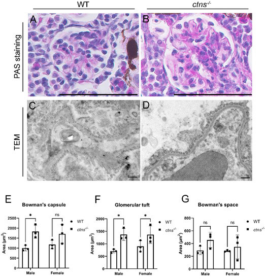 Glomerular morphology in wild-type and in ctns−/− zebrafish. (A,B) Representative images of the glomerulus of wild-type (A) and ctns−/− (B) 18-month-old zebrafish. PAS staining. The scale bars represent 50 µm. (C,D) Representative TEM images of the glomerulus of wild-type (C) and ctns−/− (D) zebrafish. The scale bars represent 1 µm. (E–G) The quantification of the surface areas of Bowman’s capsule (E), glomerular tuft (F), and Bowman’s space (G) of wild-type and ctns−/− zebrafish in both genders. Each dot represents one zebrafish, for a total of n = 3 wild-type and n = 3 ctns−/− 18-month-old zebrafish. Two-way ANOVA with Fisher’s least significant difference (PLSD) test: * p < 0.05; ns: not significant.
