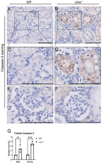 Next, we investigated whether cystinosis triggered cell death in our zebrafish model [10,12]. We performed cleaved caspase-3 immunostaining in the renal tissues of wild-type and ctns−/− zebrafish and we observed a significant increase of cleaved caspase-3 protein levels in PTEC of ctns−/− zebrafish (Figure 5B,D,G) compared with wild-type zebrafish (Figure 5A,C,G) in both genders. The expression of cleaved caspase-3 was mainly present in cells showing the polymorphous cytoplasmic vacuoles (Figure 5B,D). No expression of cleaved caspase-3 was present in glomeruli, both in wild-type and ctns−/− zebrafish (Figure 5E,F).