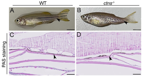 Hypopigmented spotted skin pattern in ctns−/− zebrafish. (A,B) Representative pictures of wild-type (A) and ctns−/− (B) 18-month-old zebrafish. The scale bars represent 0.5cm. The black arrowheads indicate the different striped skin patterns. (C,D) PAS-stained pictures of epidermis of wild-type (C) and ctns−/− (D) 18-month-old zebrafish. The black arrowheads highlight the melanin layer. The interruption in the melanin layer is present in ctns−/− (D) while it is absent in wild-type zebrafish (C). The scale bars represent 50 µm.