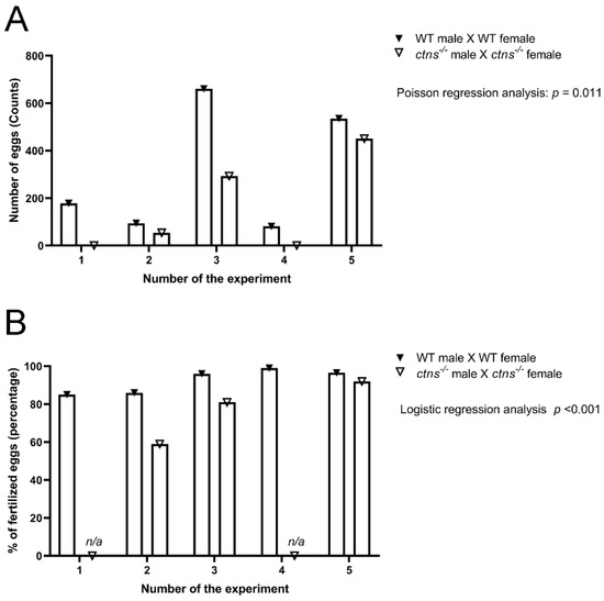 The fertility was assessed by mating female and male zebrafish (wild-type male fish, n = 4 and wild-type female fish, n = 6 and ctns−/−male fish, n = 4 and ctns−/−female fish, n = 6) in a spawning tray. In the next morning, one hour after the light, embryos were collected and the total number of eggs produced was recorded. Fertilized eggs were screened and counted from the unfertile ones using a light microscopy. The breeding was performed n = 7 times once a week in a row. Two experiments resulting in no egg productions simultaneously in both wild-type and ctns−/−zebrafish were excluded.