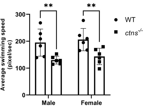 Average swimming speed in wild-type and ctns−/−zebrafish. The average speed is decreased in ctns−/−zebrafish compared with wild-type in both genders. The average swimming speed is measured in pixel/second. Each dot represents one zebrafish, for a total of n = 6 wild-type and n = 6 ctns−/−18-month-old zebrafish. Two-way ANOVA with Fisher’s least significant difference (PLSD) test: ** p < 0.01.