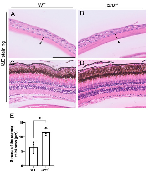 Cystinosis affects eyes resulting in cystine accumulation in several tissues, such as iris, conjunctiva and retinal epithelium, however, cornea is the most affected part due to cystine accumulation [19] and presents increased thickness [20]. Using H&E staining, we noted that ctns−/−zebrafish showed increased thickness of the stromal layer of the cornea compared with wild-type (Figure 10A,B,E) zebrafish. However, we did not reveal apparent abnormalities in the retinal epithelium of ctns−/−zebrafish (Figure 10C,D).