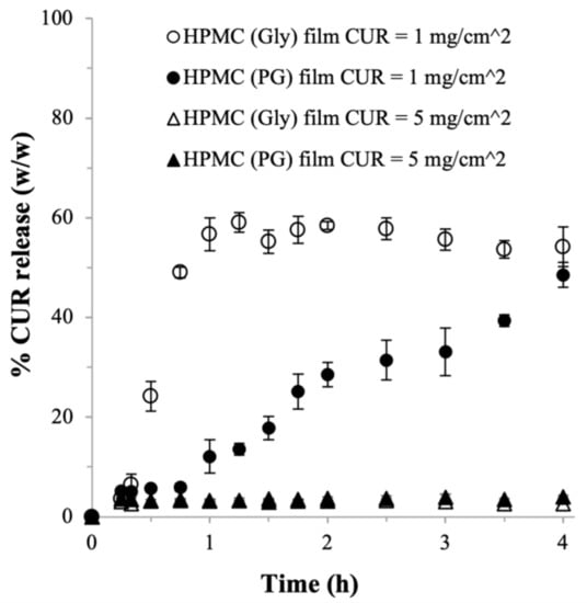 | Type of Film | Theoretical CUR Payload (mg/cm2) | % CUR Entrapment (w/w) | CUR Payload (mg/cm2) | Weight (mg/cm2) | Thickness (µm) |