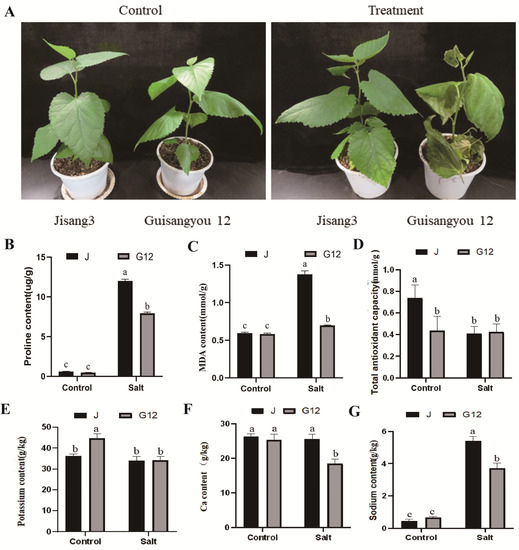 Phenotypic and physiological characteristics of mulberry varieties Jisang3 and Guisangyou12 under control and saline conditions. (A) Performance of Jisang3 and Guisangyou12 plants under control and saline conditions. (B) Proline content of root in both J and G12 groups. (C) MDA content of root in both J and G12 groups. (D) Total antioxidant capacity of root of the two varieties in saline condition. (E–G) Ion content (potassium, calcium, sodium) of root of mulberry varieties Jisang3 and Guisangyou12 under control and saline conditions. Data are means ± SD with three biological replicates. Different letters represent statistically significant differences between control and salt treated plants by Duncan’s multiple range test (p < 0.05). Jck, JS, G12ck and G12S represent the two states of Jisang3 and Guisangyou12 under control and salt stress, respectively.